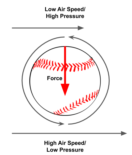 Contrary to what you might expect, a curveball doesn’t move from side to side it actually dives. A perfect curveball is sometimes referred to as a 12-6 curveball, referring to the numbers on a clockface, that is, it moves downward from 12 o’clock to 6 o’clock. How does the pitcher make it do that? A curveball, like most baseball pitches, is all about spin. There are essentially two forces at work once the ball leaves the pitcher’s hand, gravity and aerodynamics. Obviously gravity simply is what it is, it will continuously pull the ball downwards with a constant acceleration of 9.8 m/s/s or 32 ft/s/s. Without aerodynamics, you have what’s called a ballistic trajectory, which means that the projectile (a baseball in this case) follows the path you set it on and simply curves continuously and predictably due to the force of gravity. Even with aerodynamics, because a baseball is round and symmetrical (mostly), if there is no spin, the only aerodynamic force that will act on the ball is drag (slowing it down), still resulting in a very predictable trajectory (as long as you assume the weather is perfectly still with no wind gusts, turbulence, or the like, we may dive into this more if I decide to do a knuckleball article). But predictable is not going to strike out professional baseball hitters, and that’s why “movement” is such an important part of Major League pitching. When baseball folks talk about movement on a pitch, what they’re really talking about is the ball moving off of that predictable trajectory. Since there’s no way for the pitcher to directly change what’s happening to the ball once it leaves their hand, everything has to be “baked in” to the pitch as the pitcher releases it. That means spin.