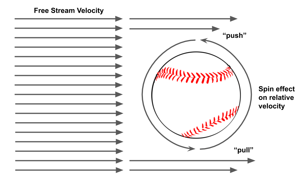 The size of this boundary layer region and the steepness of the wind speed transition is dependent on the viscosity and density of the air (more on this perhaps in a future article) and the roughness of the surface. A baseball is a pretty rough object, not only does it have a relatively well texted surface (run your finger over it, you can feel that it’s bumpy compared to, say, a steel ball bearing) but it also has those stitches which in the context of aerodynamic boundary layers, stick up like fricking mountain ranges. Now, remember that the air right next to the ball is going to be stationary relative to the surface of the ball, and the more friction there is between the air and the ball, the wider the boundary layer region will be. If the ball is spinning, that means that the boundary layer is also spinning. Effectively, the ball is “pulling” the air backwards (relative to its flight path) on one side, and “pushing” the air forward on the other. So the relative wind speed within the boundary layer is different on one side of the ball than the other.