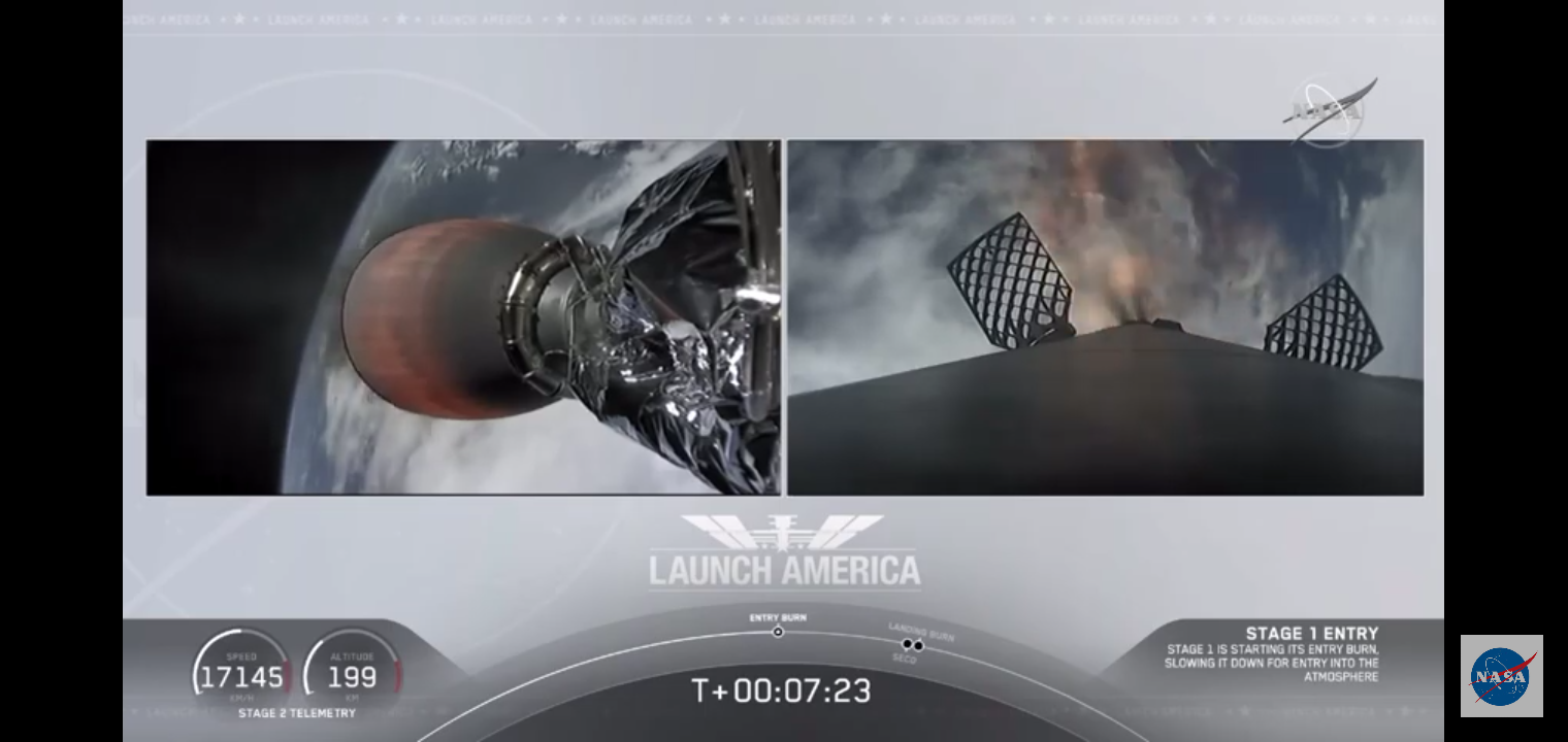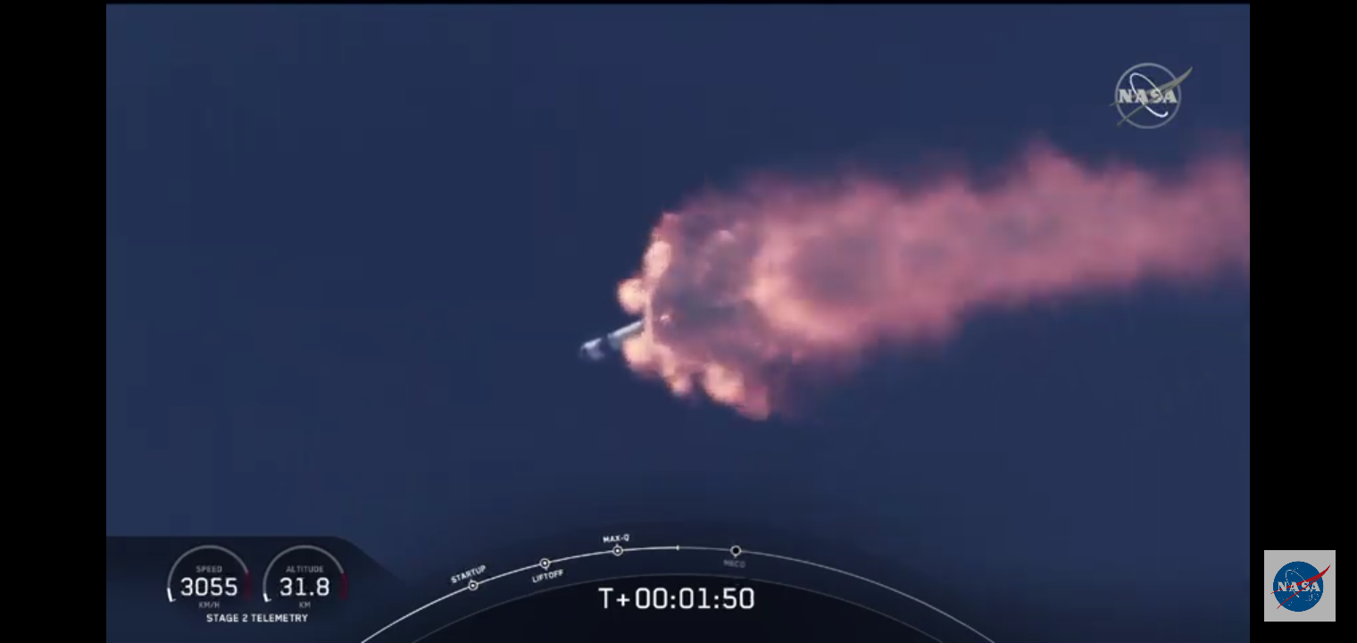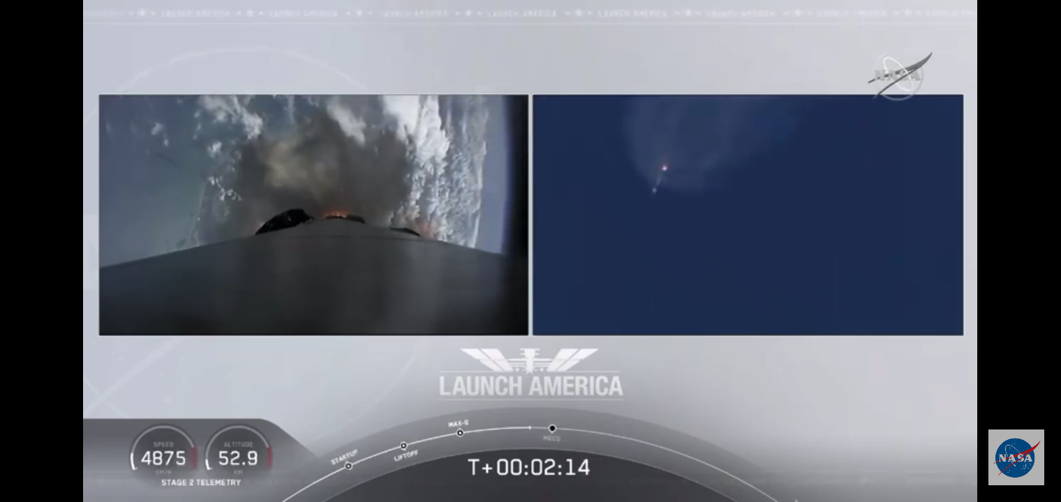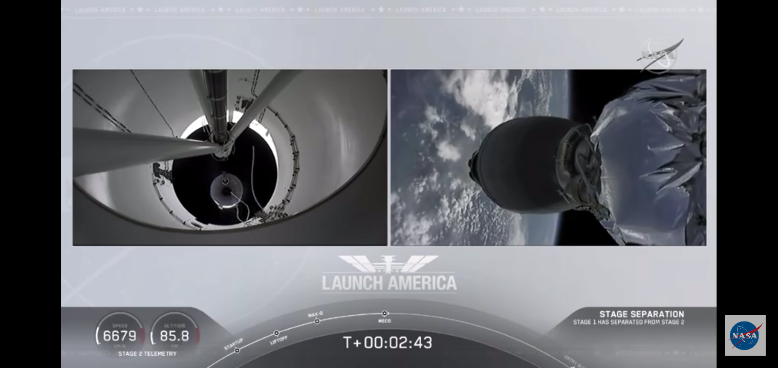 Ok here, we go, stage-1 shutdown and separation, stage-2 ignition. Those space suits are slick, Doug and Bob are ready to go to the International Space Station, or go on a time-heist for Infinity Stones, you know, whatever comes up.