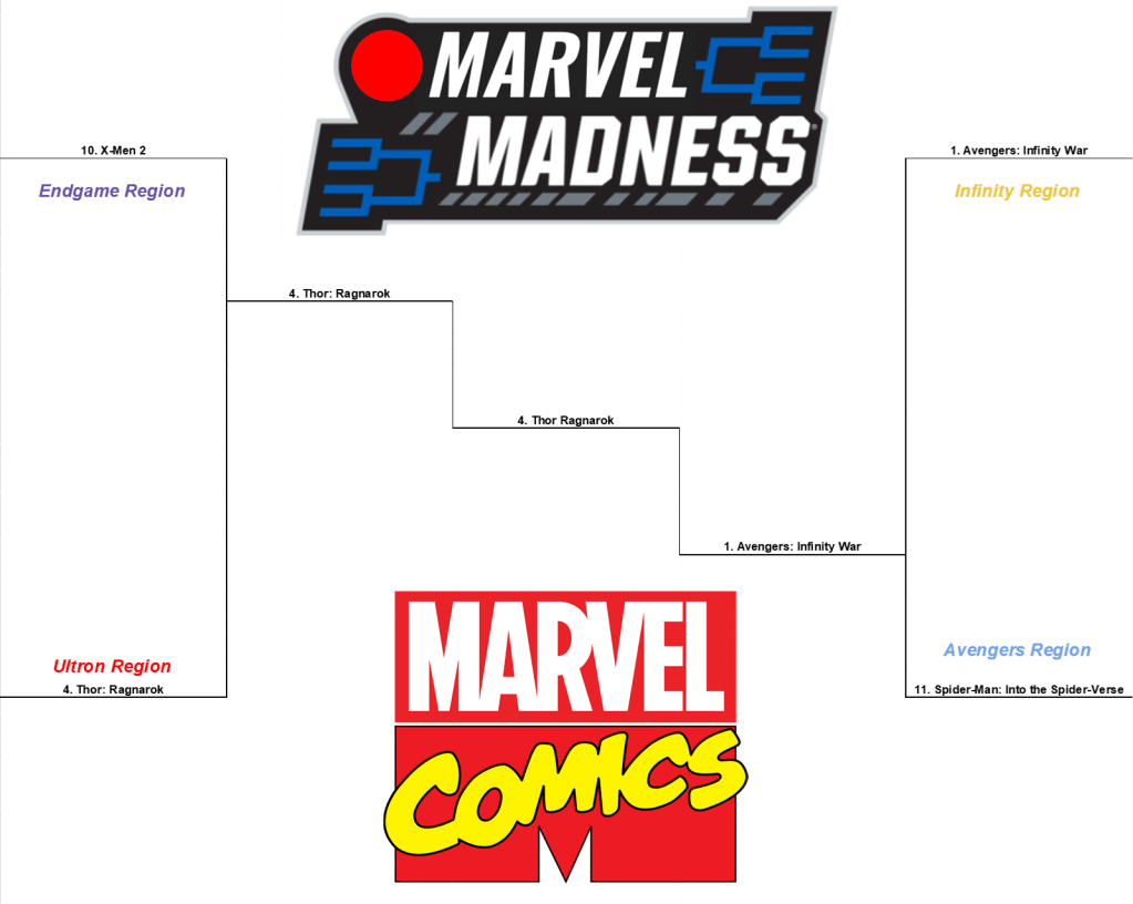 Endgame Region 1 vs Ultron Region 4 Ok, so these two movies have a lot in common. Both of them involve compelling villains with long-held grudges against our heroes expertly played by award winning actors. Both films also involve fan-favorite villains from previous installments being forced to work together with the heroes. the biggest difference is in tone. i’ve already talked a lot about how much social commentary X2 has to say and how effectively it says it. I’ve also talked a lot about how deftly Ragnarok walks a genre tightrope between action, sci-fi adventure, fantasy epic, and screwball comedy, but Ragnarok also manages to hit some really beautiful character beats along the way as we learn about Valkyrie and Hella’s background and Thor and Loki finally get the chance to really be brothers again. X2 is unfortunately a sad reminder of what might have been at this point. thinking back to 2003, X-Men had been good and then Xmen-2 came out and it was great, it looked like this franchise was on a soaring trajectory, and then, we got X-Men: The Last Stand, and then we got X-Men Origins: The Wolverine and what looked like it was going to be an all-time great film franchise turned into disjointed mass of hit-or-miss outings with confusing time-lines and a mix-and-match cast. by contrast, Thor: Ragnarok was followed by Black Panther and then the best Avenger’s outing in Infinity War and a slew of other strong MCU films. I’m not saying it’s fair to judge these movies on the strengths of their brethren, but it’s hard to separate a film from its franchise. all that being said, Thor: Ragnarok takes the first semi-final matchup on the strength of it’s genre bending gymnastics and the shear amount of fun it is to watch.