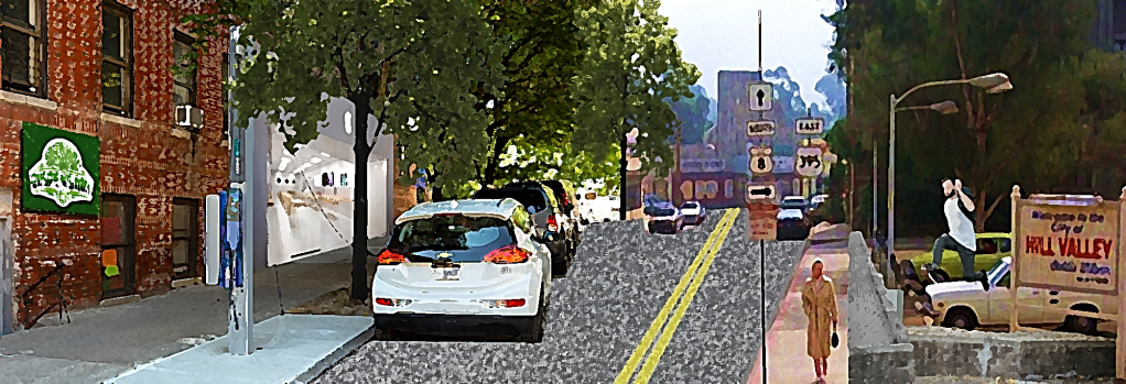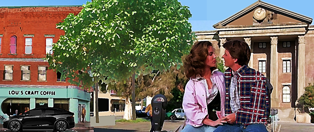 A dilapidated “Welcome to Hill Valley” SIGN on the corner.