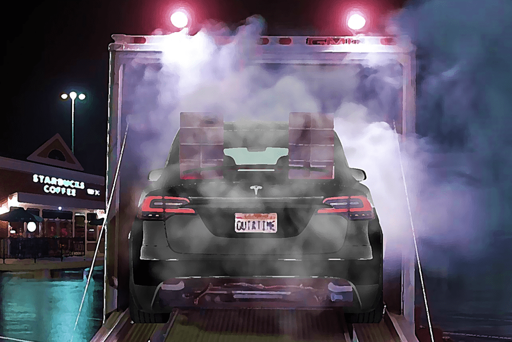 EXT. PARKING LOT – THE MOVING TESLA
